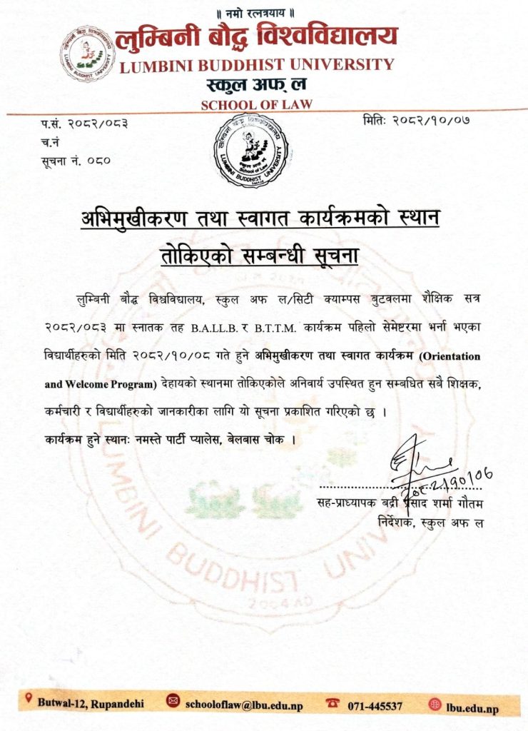 अभिमुखीकरण तथा स्वागत कार्यक्रमको स्थान तोकिएको सम्बन्धी सूचना | Notices अभिमुखीकरण तथा स्वागत कार्यक्रमको स्थान तोकिएको सम्बन्धी सूचना | Mahesh Gaire January 21, 2026 254 views 0 comments अभिमुखीकरण तथा स्वागत कार्यक्रम सम्बन्धी सूचना | Related Posts अभिमुखीकरण तथा स्वागत कार्यक्रम सम्बन्धी सूचना | January 20, 2026 386 views हिउँदे बिदा सम्बन्धी सूचना | January 5, 2026 591 views विदा सम्बन्धी सूचना | December 29, 2025 681 views BTTM तेश्रो सेमेष्ट्ररमा अध्ययनरत विद्यार्थीहरुको लागि सूचना | December 29, 2025 291 views Clinical Law विषयको मौखिक परीक्षा सम्बन्धी सूचना | December 28, 2025 352 views Leave your thought here Cancel replyYour email address will not be published. Required fields are marked * Save my name, email, and website in this browser for the next time I comment. Δ