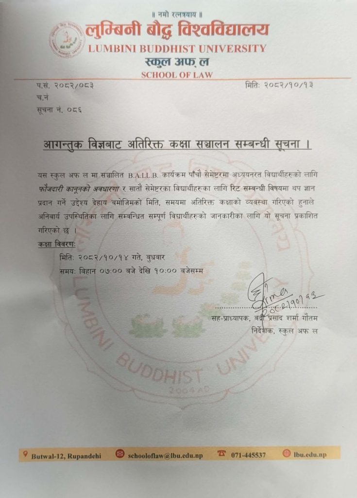 आगन्तुक विज्ञबाट अतिरिक्त कक्षा संचालन सम्बन्धी सूचना |