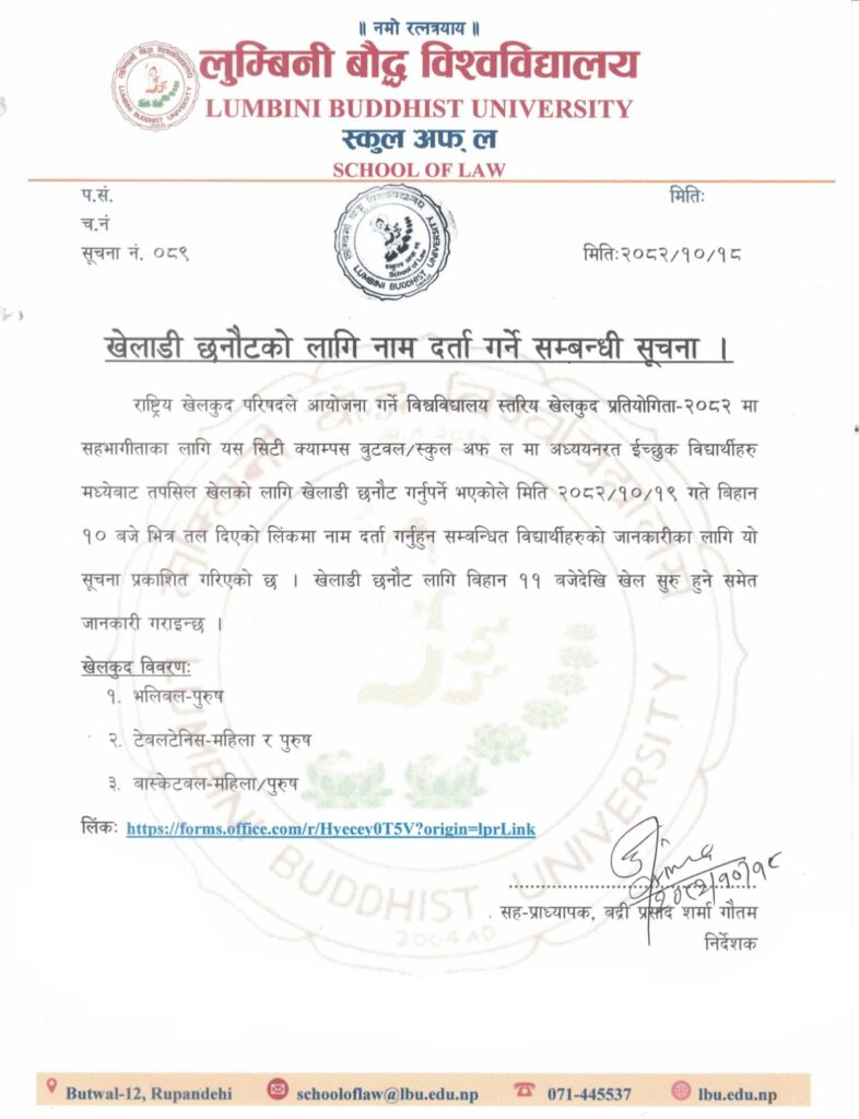 खेलाडी छनौटको लागि नाम दर्ता गर्ने सम्बन्धी सूचना | Notices खेलाडी छनौटको लागि नाम दर्ता गर्ने सम्बन्धी सूचना | Mahesh Gaire February 1, 2026 178 views 0 comments https://forms.office.com/r/Hyecey0T5V?origin=lprLink Justice Innovation मा सहभागिता सम्बन्धी सूचना | Related Posts Justice Innovation मा सहभागिता सम्बन्धी सूचना | January 29, 2026 245 views Dissertation ( थिसिस ) लेखन सम्बन्धी सूचना | January 29, 2026 173 views MIRPD कार्यक्रमको शैक्षिक सत्र २०८२/०८३ को भर्ना सम्बन्धी सूचना | January 27, 2026 155 views आगन्तुक विज्ञबाट अतिरिक्त कक्षा संचालन सम्बन्धी सूचना | January 27, 2026 313 views वित्तिय सचेतना कार्यक्रम सम्बन्धी सूचना | January 27, 2026 205 views Leave your thought here Cancel replyYour email address will not be published. Required fields are marked * Save my name, email, and website in this browser for the next time I comment. Δ