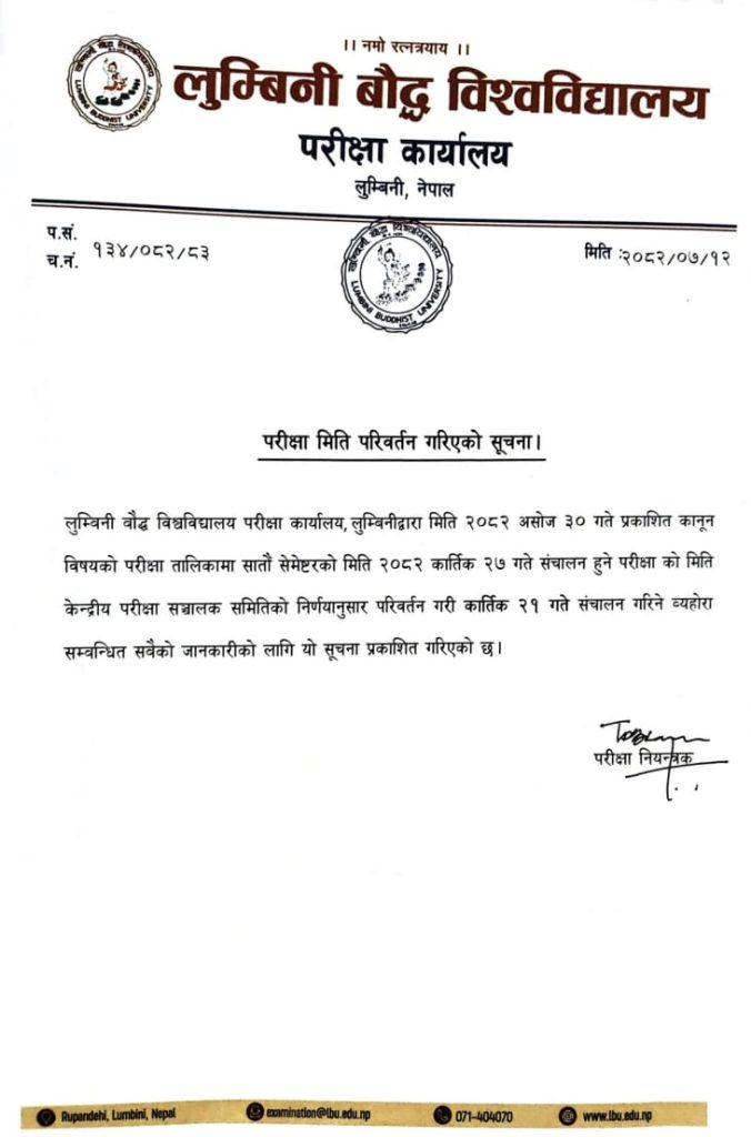 लु.बौ.वि. परीक्षा कार्यालयबाट BALLB सातौं सेमेष्टरको परीक्षा मिति परिवर्तन गरिएको सूचना | Notices लु.बौ.वि. परीक्षा कार्यालयबाट BALLB सातौं सेमेष्टरको परीक्षा मिति परिवर्तन गरिएको सूचना | Mahesh Gaire Oct 29, 2025 395 views 0 comments लु.बु.वि. परीक्षा कार्यालयबाट BALLB नवौं सेमेष्टरको अनलाईन परिक्षा आवेदन फारम भर्ने सम्बन्धी सूचना | पुस्तक नविकरण तथा पुस्तक बुझाउने सम्बन्धी सूचना | Related Posts पुस्तक नविकरण तथा पुस्तक बुझाउने सम्बन्धी सूचना | Oct 29, 2025 286 views लु.बु.वि. परीक्षा कार्यालयबाट BALLB नवौं सेमेष्टरको अनलाईन परिक्षा आवेदन फारम भर्ने सम्बन्धी सूचना | Oct 28, 2025 397 views लु.बौ.वि. परीक्षा कार्यालयबाट BALLB कार्यक्रम अन्तर्गत आठौं सेमेष्टरको परीक्षाको परीक्षाफल प्रकाशन गरिएको सूचना | Oct 17, 2025 507 views लु.बौ.वि. परीक्षा कार्यालयबाट BALLB कार्यक्रमको स्थगित परीक्षाको परीक्षा तालिका प्रकाशित गरिएको सूचना | Oct 17, 2025 415 views दशैं, तिहार तथा छट पर्वको बिदा सम्बन्धी सूचना | Sep 22, 2025 573 views Leave your thought here Cancel replyYour email address will not be published. Required fields are marked * Save my name, email, and website in this browser for the next time I comment. Δ