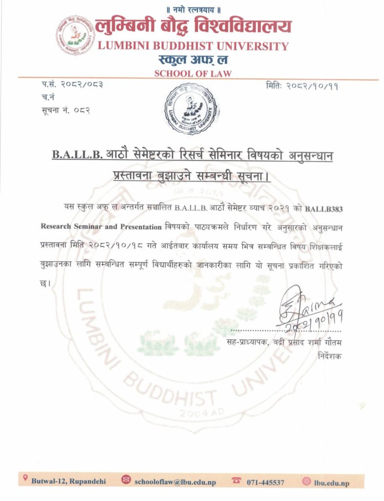 BALLB आठौ सेमेष्टरको रिसर्च सेमिनार विषयको अनुसन्धान प्रस्तावना बुझाउने सम्बन्धी सूचना | Notices BALLB आठौ सेमेष्टरको रिसर्च सेमिनार विषयको अनुसन्धान प्रस्तावना बुझाउने सम्बन्धी सूचना | Mahesh Gaire January 25, 2026 145 views 0 comments श्रीपंचमी (सरस्वती पुजा) सम्बन्धी सूचना | Trial Advocacy विषयको मौखिक परीक्षा सम्बन्धी सूचना | Related Posts लु.बौ.वि. मानविकी तथा सामाजिक शास्त्र संकाय अन्तर्गत MIRPD कार्यक्रमको शैक्षिक सत्र २०८२/८३ को प्रवेश परीक्षाको नतिजा प्रकाशित गरिएको सूचना | January 26, 2026 41 views मौखिक परीक्षा सम्बन्धी सूचना | January 25, 2026 111 views Trial Advocacy विषयको मौखिक परीक्षा सम्बन्धी सूचना | January 25, 2026 137 views श्रीपंचमी (सरस्वती पुजा) सम्बन्धी सूचना | January 22, 2026 327 views लु.बौ.वि. परीक्षा कार्यालयबाट स्नातकोत्तर तह International Relation Peace and Diplomacy कार्यक्रम (दोश्रो सेमेष्टर) नियमित परीक्षाको परीक्षा तालिका प्रकाशित गरिएको सूचना | January 22, 2026 140 views Leave your thought here Cancel replyYour email address will not be published. Required fields are marked * Save my name, email, and website in this browser for the next time I comment. Δ
