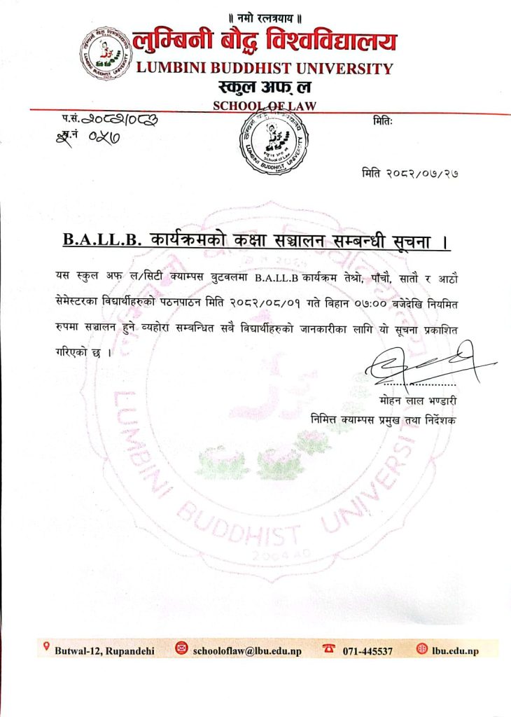 लु.बौ.वि. परीक्षा कार्यालयबाट BALLB नवौं सेमेष्टरको परीक्षा तालिका प्रकाशित गरिएको सूचना |