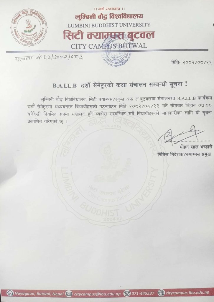 December 7, 2025 2025-12-07 19:31BALLB दशौं सेमेष्टरको कक्षा संचालन सम्बन्धी सूचना |