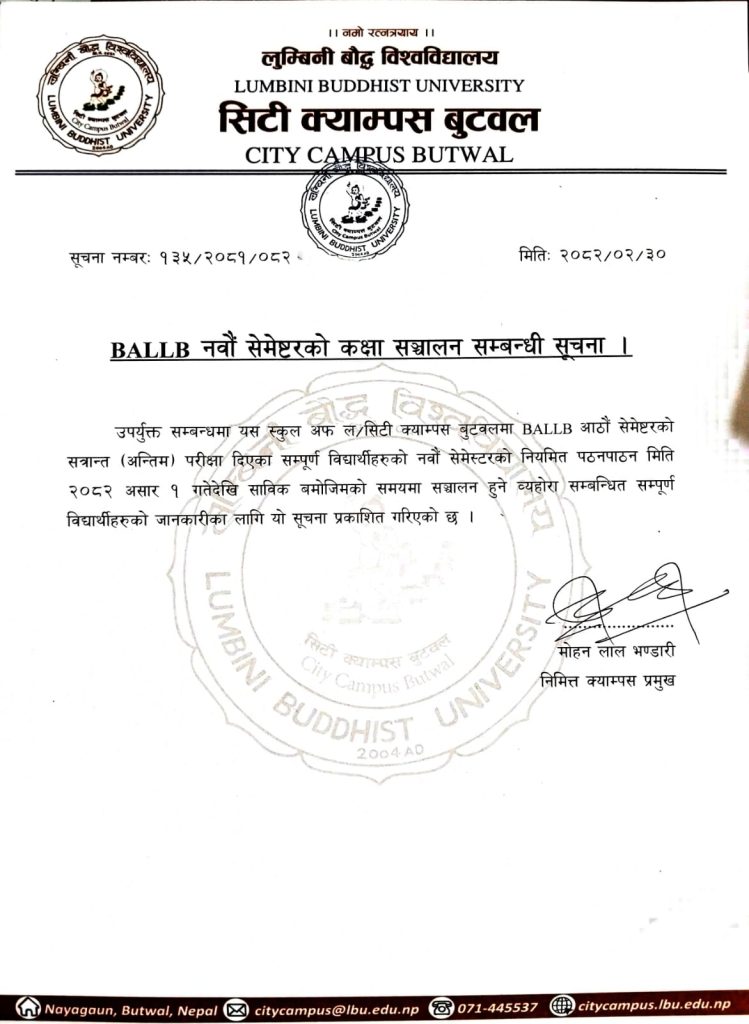 BALLB नवौं सेमेस्टरको कक्षा संचालन सम्बन्धी सूचना |