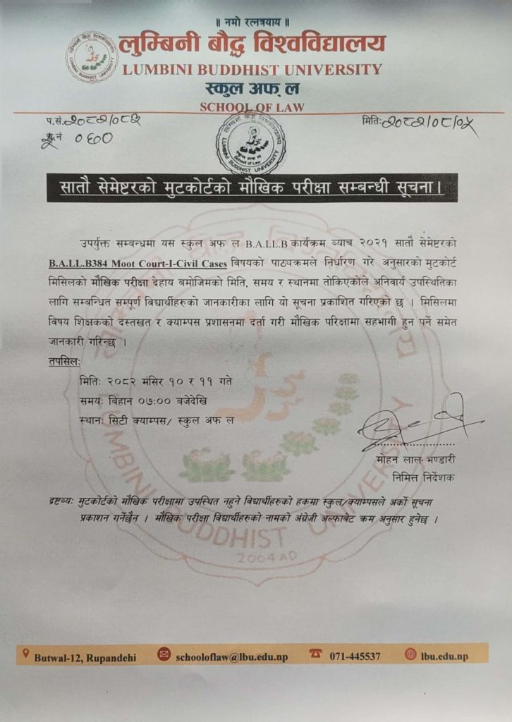 BALLB-2021 ब्याच सातौ सेमेष्टरको मुटकोर्टको मौखिक परिक्षा सम्बन्धी सूचना | Notices BALLB-2021 ब्याच सातौ सेमेष्टरको मुटकोर्टको मौखिक परिक्षा सम्बन्धी सूचना | Mahesh Gaire November 21, 2025 200 views 0 comments लु.बौ.वि. परीक्षा कार्यालयबाट BALLB कार्यक्रम अन्तर्गत पुनर्योग र उत्तरपुस्तिका पुनःपरीक्षणको नतिजा प्रकाशन गरिएको सूचना | Related Posts लु.बौ.वि. परीक्षा कार्यालयबाट BALLB कार्यक्रम अन्तर्गत पुनर्योग र उत्तरपुस्तिका पुनःपरीक्षणको नतिजा प्रकाशन गरिएको सूचना | November 17, 2025 415 views लु.बौ.वि. परीक्षा कार्यालयबाट MIRPS कार्यक्रम अन्तर्गत पहिलो र तेस्रो सेमेष्टरको परीक्षाफल प्रकाशन गरिएको सूचना | November 17, 2025 334 views BALLB Updated Syllabus I to X November 17, 2025 687 views BTTM-2025, पहिलो सेमेष्टरको कक्षा संचालन सम्बन्धी सूचना | November 17, 2025 270 views BALLB पहिलो सेमेष्टरको कक्षा संचालन सम्बन्धी सूचना | November 13, 2025 282 views Leave your thought here Cancel replyYour email address will not be published. Required fields are marked * Save my name, email, and website in this browser for the next time I comment. Δ