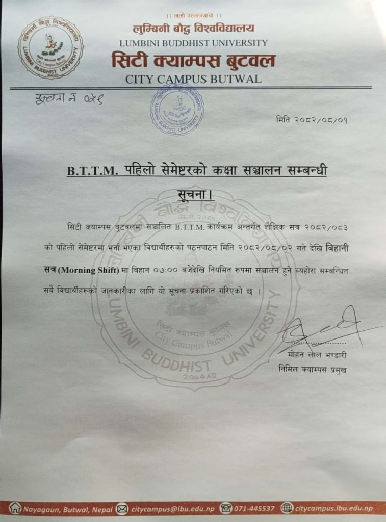 BTTM-2025, पहिलो सेमेष्टरको कक्षा संचालन सम्बन्धी सूचना |