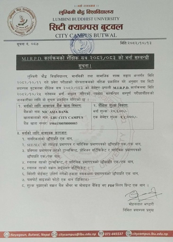 January 27, 2026 2026-01-27 20:03MIRPD कार्यक्रमको शैक्षिक सत्र २०८२/०८३ को भर्ना सम्बन्धी सूचना |